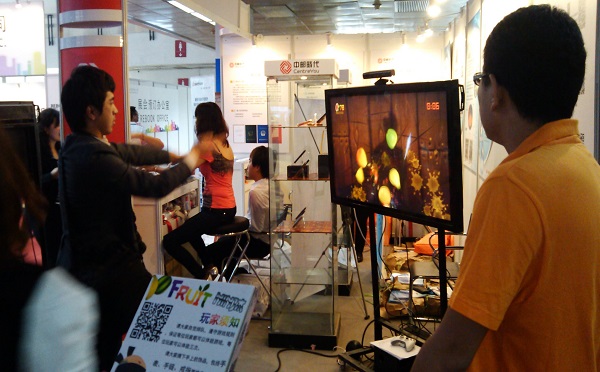 体感切水果游戏:感受者化手为刀,挥舞两手去碰触显示屏上坠落的众多水果,成功的剖开瓜果就能得到积分,与此同时还需要考虑躲开炸弹。