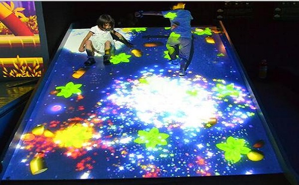 互动投影系统为融合当今世界最高科技的广告和娱乐互动系统,提供一种不同寻常并激动人心的广告与娱乐交相辉映的效果系统,适用于所有公共室内场所,特别是休闲、购物、娱乐及教育场所。目前虚拟互动技术已完成人机交互部分,并有多种与自然或虚拟世界的仿真模拟。