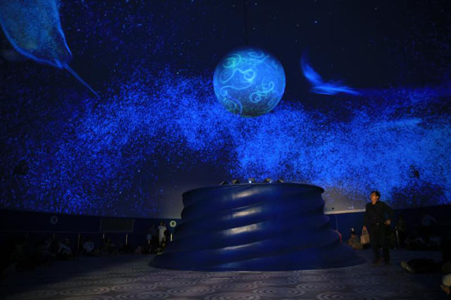 在南极企鹅馆内,一座巨大的球幕影院吸引了不少游客。据介绍,这是目前国内唯一的360度裸眼3D海洋主题球幕影院,球幕直径达18米,利用三维仿真技术,模糊现实与虚拟的边界,真实还原极地海洋世界。整个影院可以容纳近300人同时观影,只要坐着或躺在影院内的地毯上抬头仰望,就可以身临幕中的情境。记者在厅内观赏了一场10分钟的原创影片《时空之海》,时而被深邃的天吸引,时而为湛蓝的海惊叹,还有许许多多不具名的水生物应接不暇,仿佛身处海底世界一般。此外,馆内还设有通体采用亚克力玻璃材质打造的全球最大“企鹅超级碗”,全景呈现帝企鹅、阿德利企鹅与巴布亚企鹅等近百只企鹅的自然生活形态,喜欢企鹅宝宝的小朋友一定不能错过。