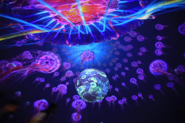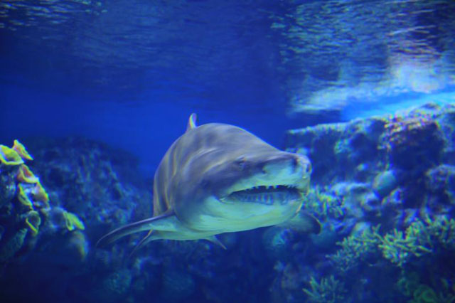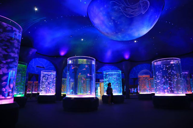 在珊瑚水母馆,记者被五颜六色的大型珊瑚塔深深吸引。绚烂多彩的珊瑚族群和成千上万只水母在展缸内幻化出一幅自由恣意的图景。而最令人震撼的则是火山鲸鲨馆。火山造型深处,隐匿着全球首创的七度倾斜沉浸式鲸鲨展缸,跟随魔鬼鱼、巨斑等群游性鱼类曼妙的身姿,游客可以尽情遨游在神秘奇幻的蓝色世界;乘坐小型潜水器进入到鲸鲨池内,与拥有“星空之背”的庞大鲸鲨亲密邂逅;或许猛然回头间,你还会被突然抵近的残酷嗜血的沙虎鲨、豹纹鲨、黑鳍鲨吓到尖叫。